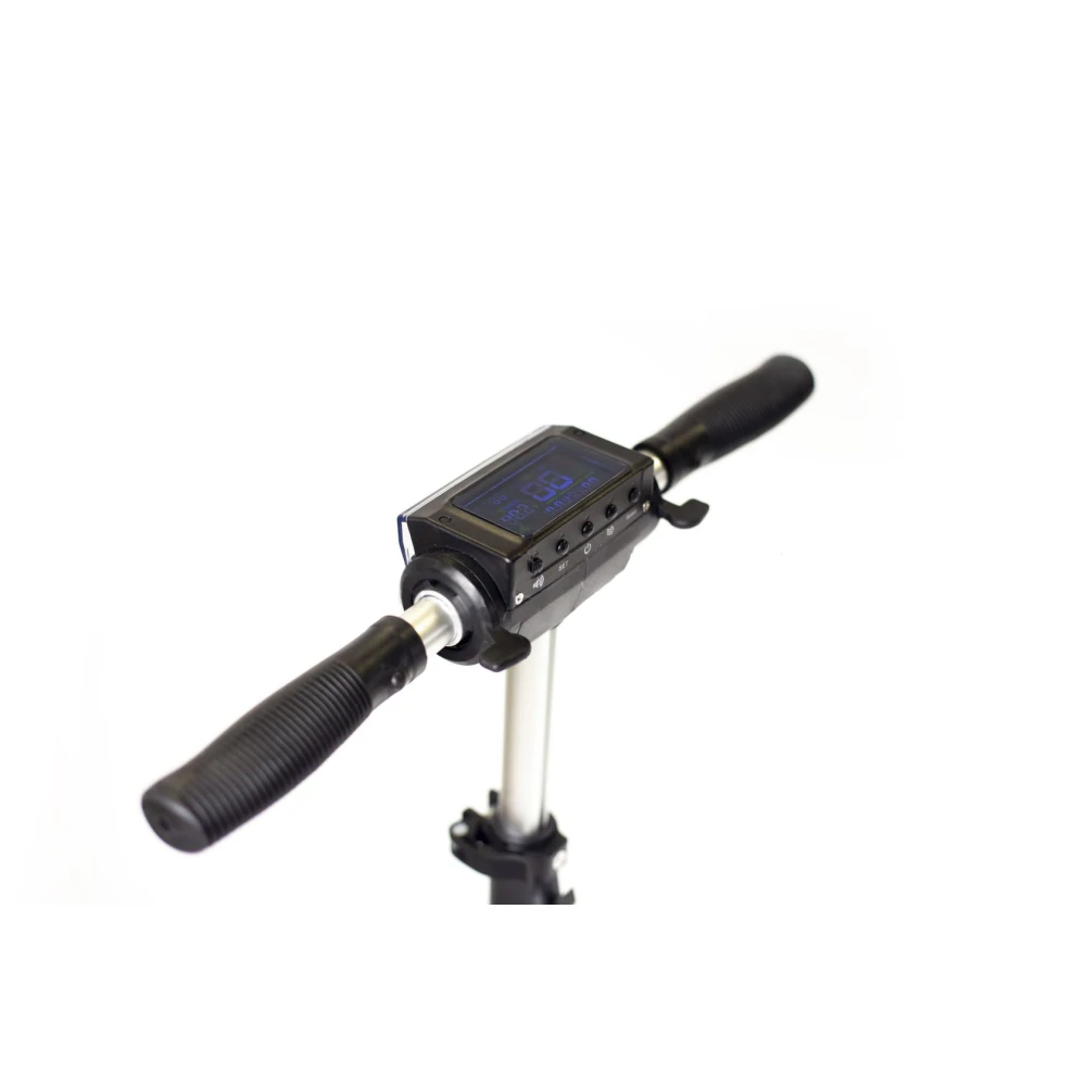 На электросамокате регулируется руль по высоте, при этом размеры самоката значительно уменьшаются. Самокат имеет два фонаря, которые расположены спереди и сзади. На ручке электросамоката имеется дисплей, который отображает всю важную информацию для его владельца.