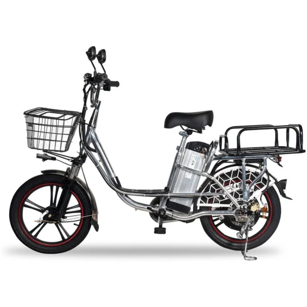 Помимо электродвигателя, Minako V12 Lux оборудован механическим приводом в виде односкоростной цепной трансмиссии. Седло велосипеда широкое и мягкое, что позволяет с комфортом ездить даже самые большие расстояния. Комплектация велосипеда Minako V12 Lux богата – в отличие от конкурентов он с завода имеет зеркала заднего вида, защитные крылья, подножку, корзинку и багажник для личных вещей.